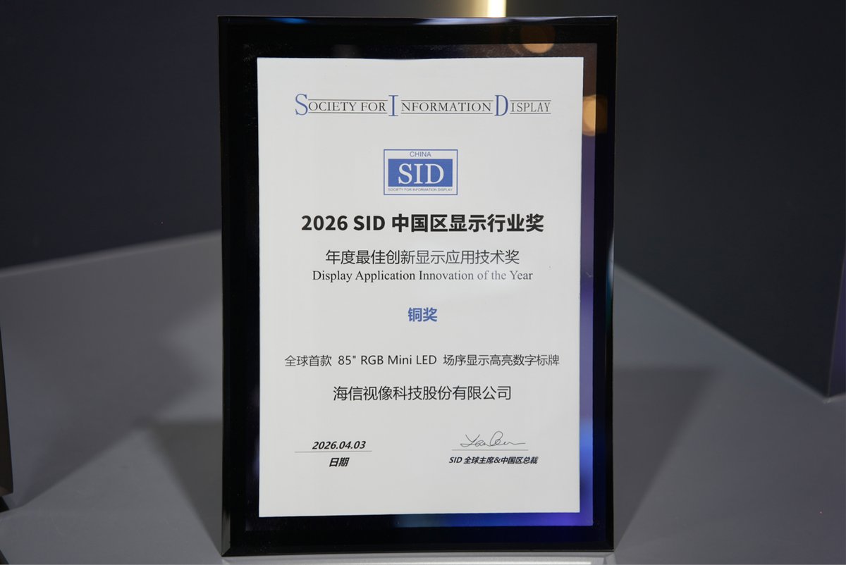 近日,2026年国际显示技术大会(ICDT)在重庆举办。海信凭借显示领域的突破性创新,一举斩获三项重磅大奖,包括全球首创的RGB-Mini LED技术入选“中国显示行业十大突破性进展”奖,成为近十年唯一获得重大突破奖的大屏液晶显示技术,全球首款玲珑4芯真彩背光RGB-Mini LED电视116UX荣膺“年度最佳显示应用产品金奖”,全球首款85吋RGB-Mini LED场序显示高亮数字标牌斩获“年度最佳创新显示应用技术奖”。