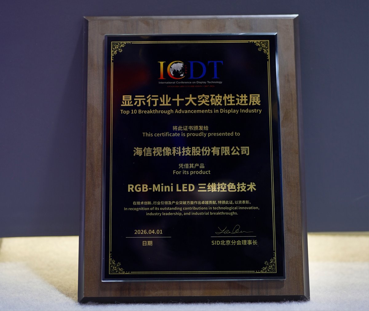 作为国际信息显示学会SID主办的行业顶级盛会,ICDT是全球显示领域的“风向标”,其评选的系列奖项有着极为严苛的评审标准。值此ICDT十周年之际,52位SID北京分会技术专家多轮评审选出“中国显示行业十大突破性进展”,获奖成果代表了过去十年中国显示行业在技术研发、产业化及应用拓展等领域取得的重大突破。